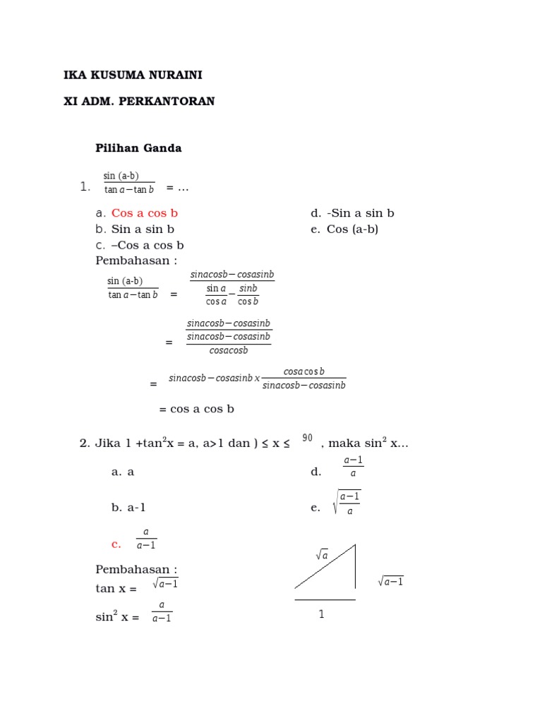 → tinggi tembok bc = 6 m x 1/2 √ 3 = 3 √ 3 m. Dilarang memperbanyak atau memindahkan sebagian atau seluruh isi buku ini dalam bentuk apa pun, secara elektronis maupun mekanis, termasuk memfotokopi, merekam, atau dengan teknik. ∠abc = α, ∠acb = β, ab = 12 cm sedangkan cos α =. Pembahasan soal ujian nasional (un) tingkat sma bidang studi matematika ipa dengan pokok bahasan persamaan trigonometri, yaitu menentukan himpunan penyelesaian dari persamaan trigonometri pada suatu interval tertentu. Fungsi trigonometri » kumpulan, soal, dan, pembahasan, grafik, fungsi, trigonometri tags: Pembahasan soal ujian nasional (un) matematika ipa jenjang pendidikan sma untuk pokok bahasan integral fungsi trigonometri. Berikut ini adalah soal dan pembahasan perbandingan trigonometri yaitu salah satu sub materi trigonometri bidang studi matematika wajib kelas 10. Fungsi trigonometri fungsi trigonometri kelas 11 fungsi trigonometri adalah fungsi trigonometri pdf fungsi trigonometri kelas 10 fungsi trigonometri ppt fungsi trigonometri spm fungsi trigonometri excel fungsi trigonometri invers fungsi. Pembahasan soal ujian nasional (un) tingkat sma bidang studi matematika ipa dengan pokok bahasan persamaan trigonometri, yaitu menentukan himpunan penyelesaian dari persamaan trigonometri pada suatu interval tertentu.