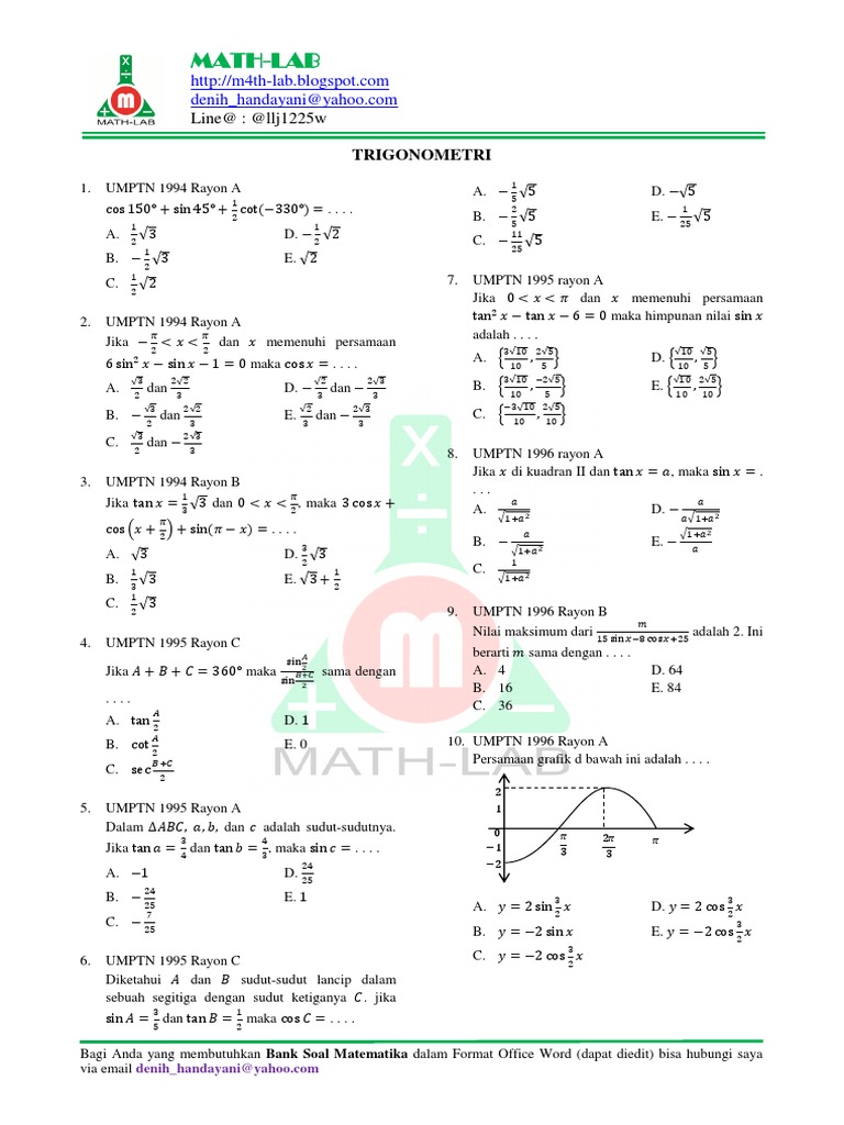 = 2 sin ½ (102)° cos ½ (90)°. Advertisements sebagai sebuah bangun datar, segitiga memiliki berbagai pengembangan. Jika cos x = sin α, maka x = α + k. Tan xº = tan p ⇒ x₁ = p + 180.k ⇒ x₂ = (180 + p) + 360.k. Pada kesempatan kali ini saya akan memposting 16 soal matematika wajib sma kelas 10 tentang trigonometri. Matematika kelas x trigonometri dasar part 4 aturan sin dan cos jurusan tiga angka kutub cartesius latihan soal dan pembahasan bab trigonometri kelas 10 sma part 2 contoh. Dec 16 2018 soal dan pembahasan trigonometri sma kelas 10. Dari soal di atas bisa kita simpulkan bahwa jenis soal di atas adalah contoh soal penjumlahan trigonometri. ∫ cos x dx = sin x + c 3.