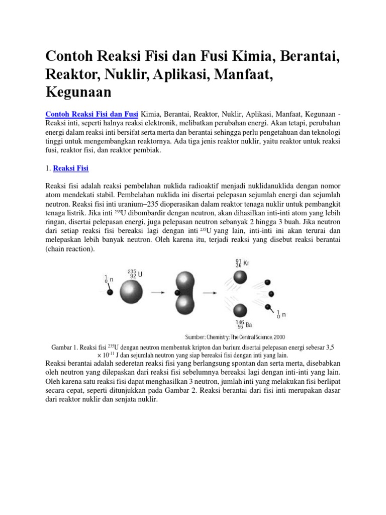 Dalam fisika nuklir, fusi nuklir ( reaksi termonuklir) adalah sebuah reaksi di mana dua inti atom bergabung membentuk satu atau lebih inti atom yang lebih. Beberapa contoh reaksi fusi nuklir yang dapat dilangsungkan di permukaan bumi adalah sebagai berikut: Mengenal fisi dan fusi : Asam basa bentuk molekul entalpi kelarutan laju reaksi termokimia. If you are looking for contoh soal peluruhan inti dan pembahasan fisika inti youve come to the right place. Oleh karena baik reaksi fisi dan fusi bersifat eksoterm (melepaskan energi) maka kita dapat memanfaatkannya sebagai reaktor nuklir untuk masa depan yang lebih baik. Dua reaksi penting dalam proses nuklir. Contoh reaksi inti antara lain adalah 7 n14 + 2 he4 → 8 o17 + 1 h1 yaitu inti atom nitrogen ditembak dengan partikel (2 he4) menjadi inti atom oksigen dengan disertai timbulnya proton (1. Perhatikan reaksi di bawah initentukan unsur x 14 17 1 7n x 😯 1h 2.