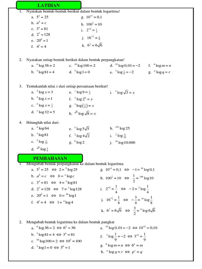 Logaritma yaitu sebuah operasi matematika yang merupakan kebalikan (atau invers) dari eksponen atau pemangkatan. Secara sederhana, logaritma dapat disebut sebagai kebalikan dari perpangkatan atau eksponensial. Sebelum belajar tentang sifat sifat logaritma lebih baiknya kita mengetahui terlebih dahulu apa itu logaritma. Selasa, 20 oktober 2020 edit. Sebagai contoh, jika 10³ = 1000 maka dalam bentuk logaritma menjadi log 1000 = 3. A > 0 dan a ≠ 1. About press copyright contact us creators advertise developers terms privacy policy & safety how youtube works test new features press copyright contact us creators. Logaritma adalah invers dari eksponen. Hubungan logaritma dan eksponen adalah sebagai berikut : 2 log ( 3x+5 ) = 16.