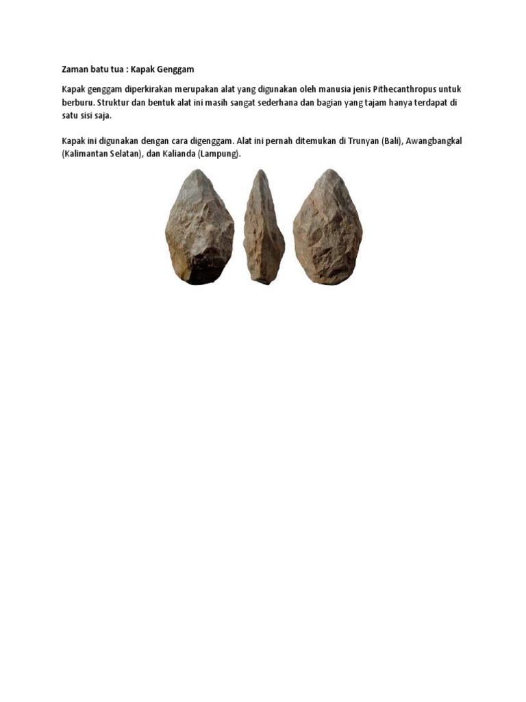 Dilihat dari sudut mata pencariannya, periode ini disebut masa mengumpulkan makanan (food gathering). Dengan begitu, peninggalan zaman ini diberi nama kebudayaan. Zaman paleotikum atau disebut juga dengan zaman batu tua. Paleolitikum berasal dari dua kata yaitu paleos yang berarti tua dan litikum yang berarti batu. Pengertian pra sejarah/pra aksara kebudayaan zaman pra aksara awal zaman batu zaman batu tua (paleolithikum) zama batu madya (mesolithikum) zaman batu muda (neolithikum) zaman batu besar (megalithikum) zaman logam corak kehidupan masa berburu dan meramu masa bercocok tanam masa perundagian Kapak genggam kapak genggam banyak ditemukan di daerah pacitan. Walaupun demikian, bentuk dan hasil kebudayaan paleolitikum tidak serta merta punah dan tertap mengalami penyempurnaan. Ada juga flakes atau alat serpih yang ditemukan di sragen. Pada periode ini, terdapat beberapa jenis manusia purba yang sudah hidup dan menetap di permukaan bumi.